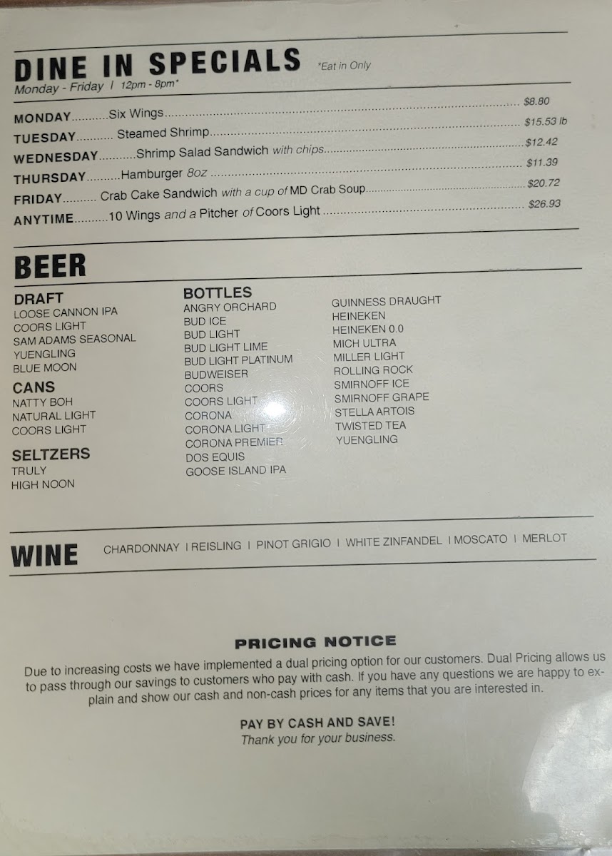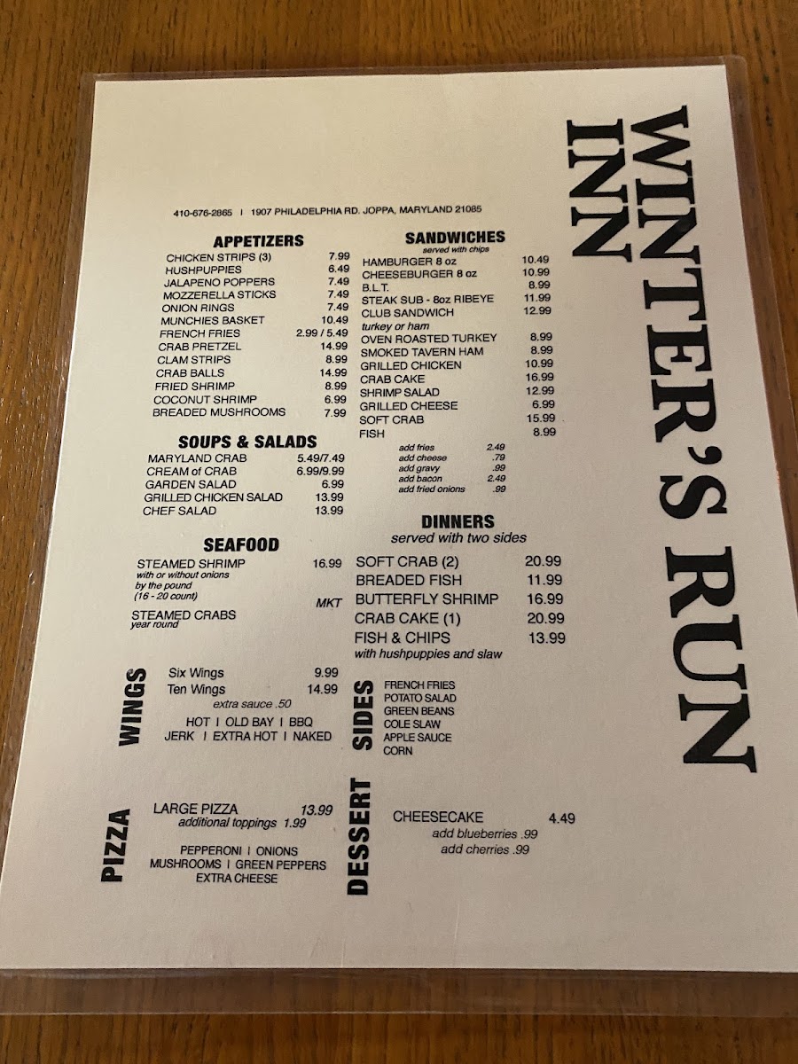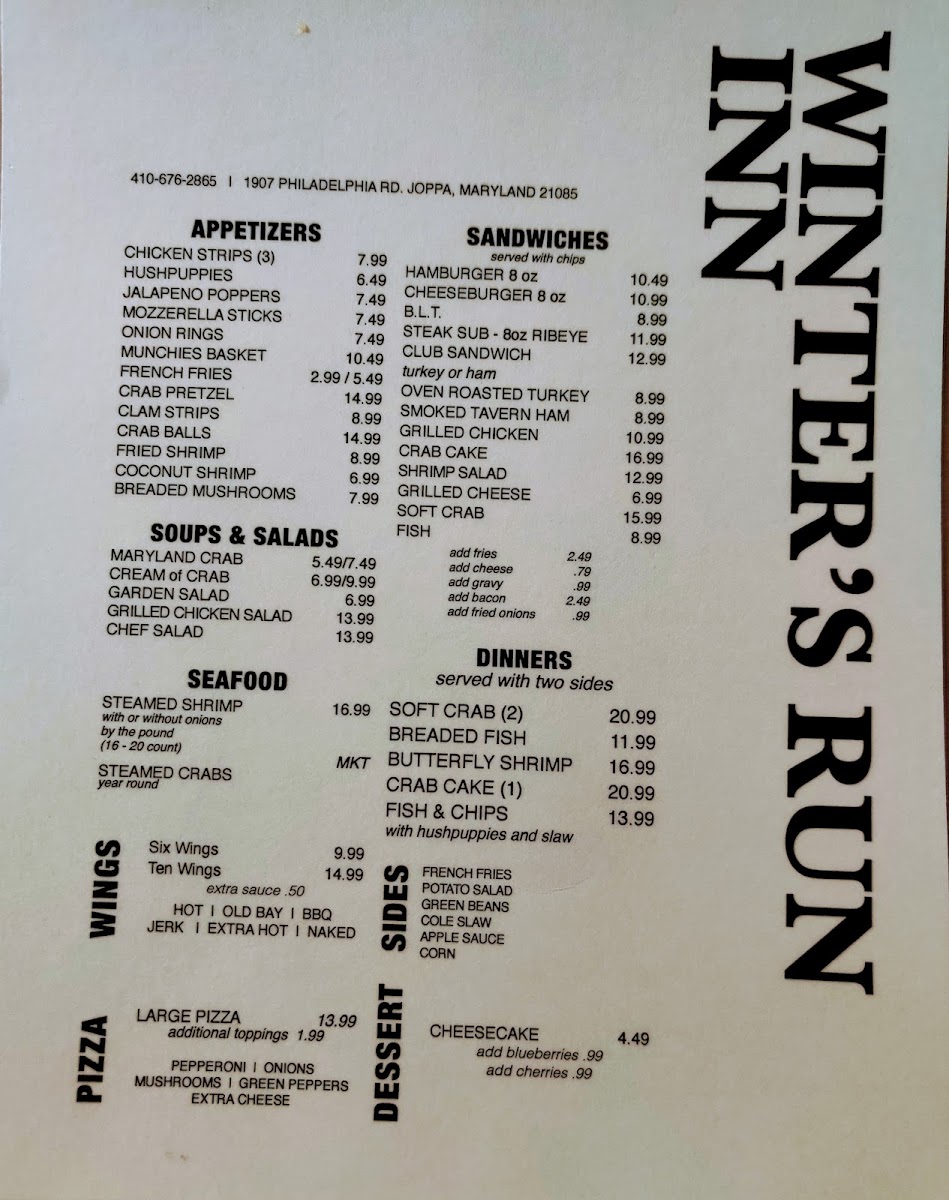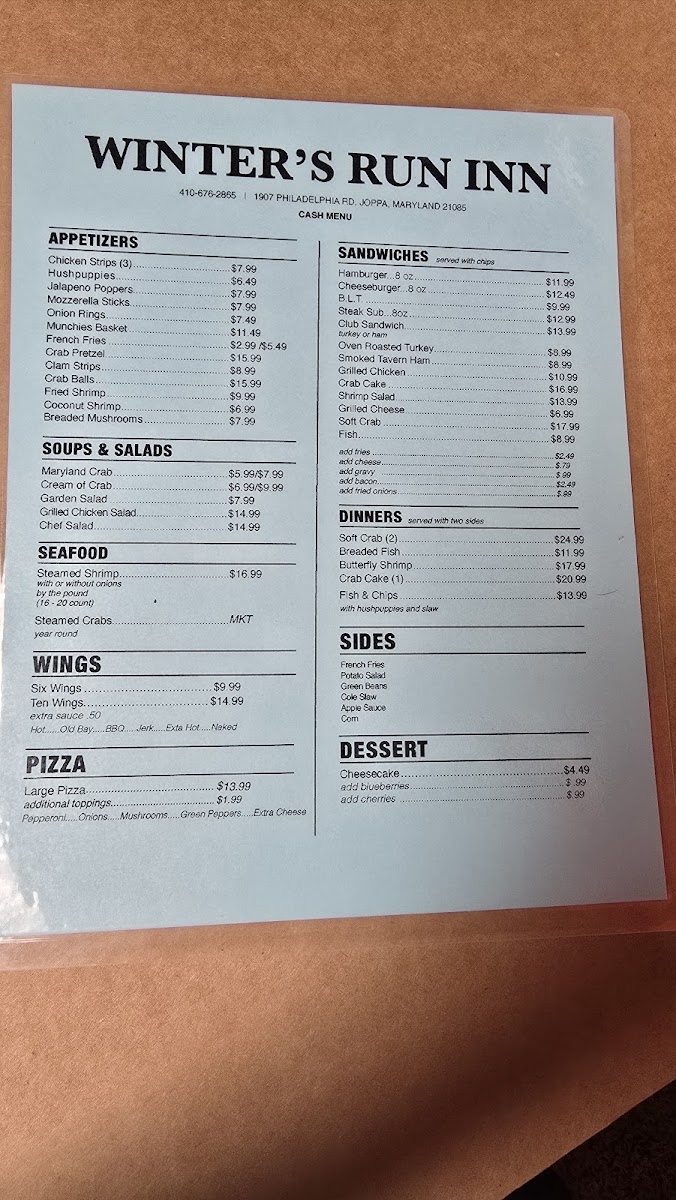 Winters Run Inn Inc offers a straightforward, down-to-earth menu that centers on fresh, classic Maryland seafood alongside simple, satisfying sides and casual bites. The menu feels perfectly suited to the relaxed, welcoming atmosphere of this Joppatowne favorite, where enjoying the season’s best crabs and shrimp is a laid-back, social experience.